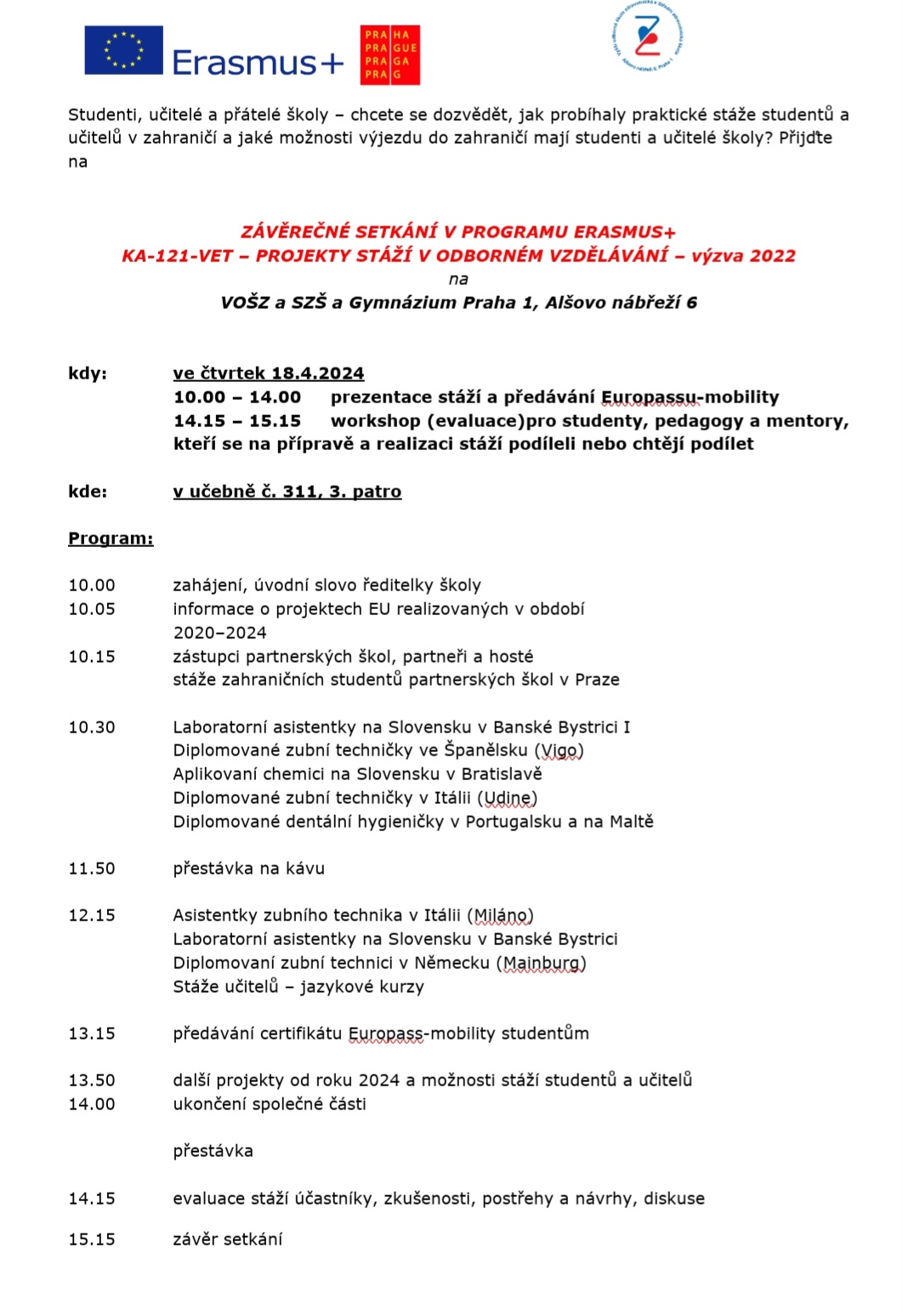 Studenti, učitelé a přátelé školy – chcete se dozvědět, jak probíhaly praktické stáže studentů a učitelů v zahraničí a jaké možnosti výjezdu do zahraničí mají studenti a učitelé školy? Srdečně Vás zveme na závěrečné diseminační a evaluační setkání absolventů stáží v programu Erasmus+, které se bude konat ve čtvrtek 18. 4. 2024 od 10:00 hodin v budově školy na Alšově nábřeží 6, Praha 1.