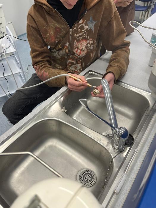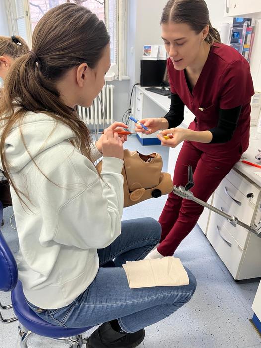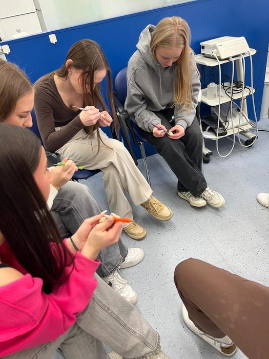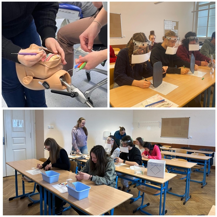 Studenti z 2 DHA pod vedením Bc. Němcové, DiS. a Mgr. Štajnerové seznámily žáky z 2. AF, 2. AG a 2. AO se základy zubní hygieny a péče o dutinu ústní. V praktické části ve školním„Centru DDH“ jim zkontrolovaly přinesené pomůcky a nechyběl ani nácvik správné techniky čištění a detekce plaku.