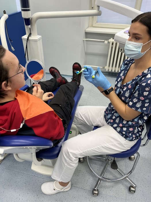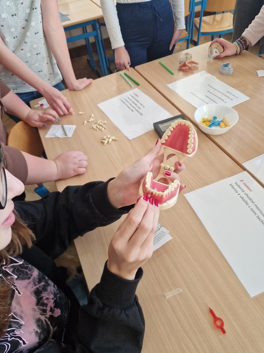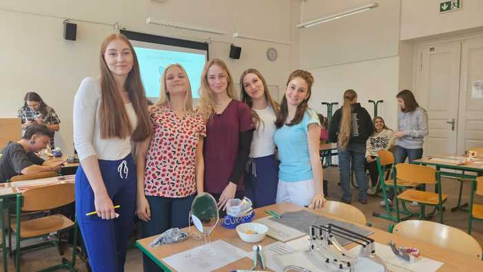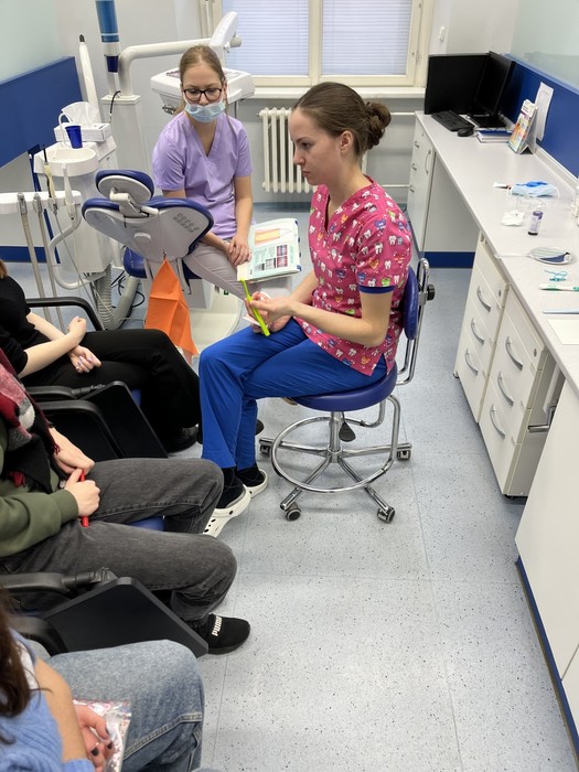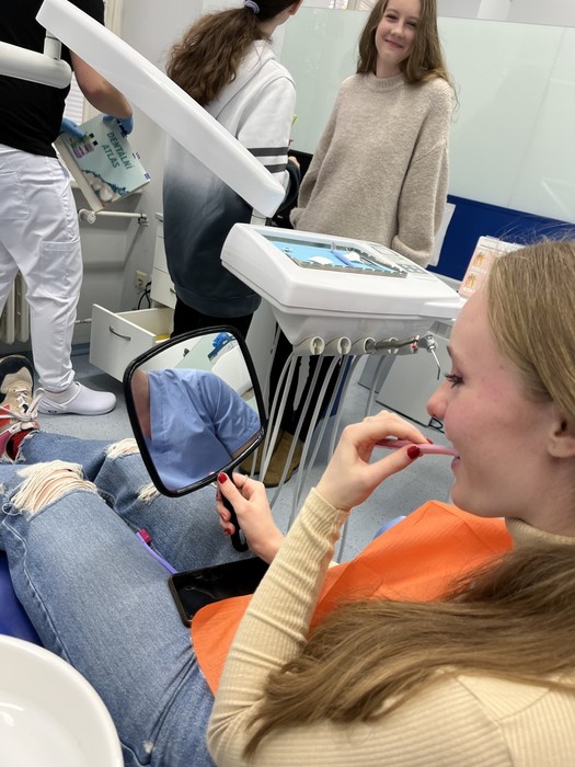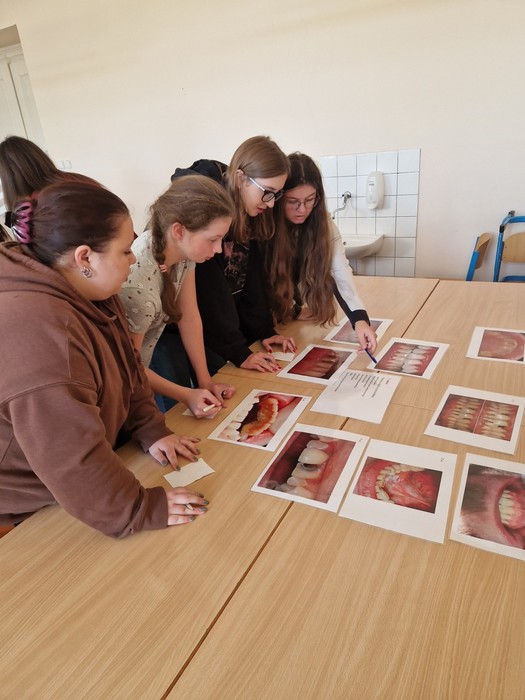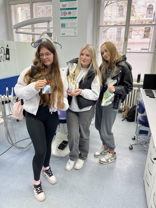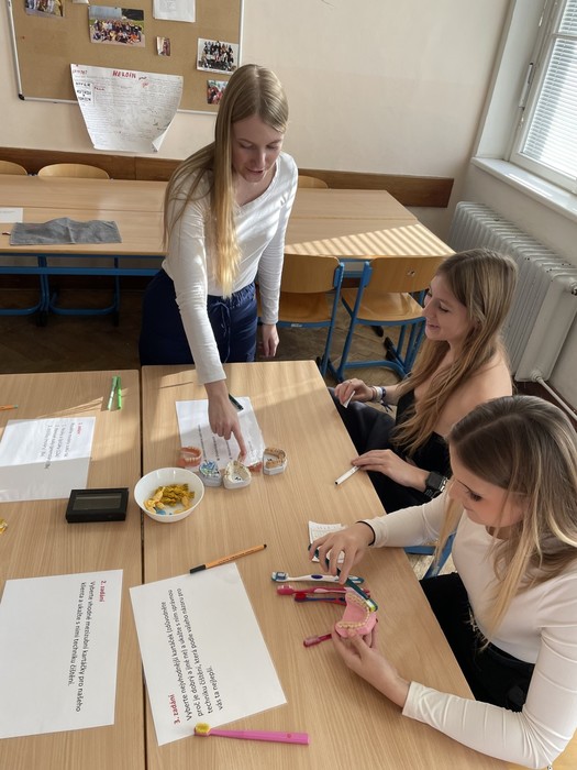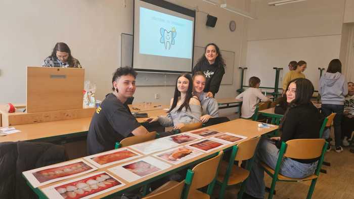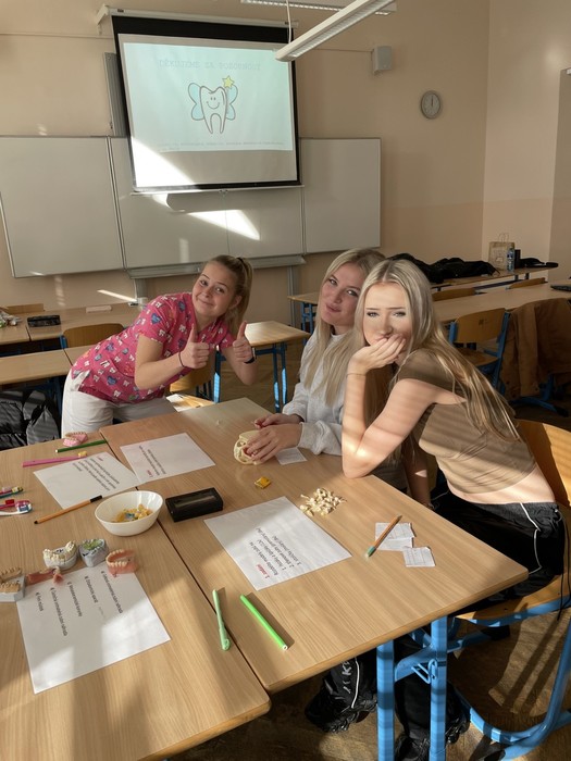 Studenti 2.DHA pod vedením pedagogů Elišky Němcové, DiS. a Mgr. Ludmily Štajnerové připravili pro naše žáky druhých ročníků střední školy dvoudílný odborný program. V přednáškové části byli žáci seznámeni s tím, jak se správně starat o své zuby a dutinu ústní. V druhé, praktické části, za asistence našich pedagogů a studentů z 2.DHA si zkontrolovali přinesené pomůcky na čištění zubů, nacvičili si správnou techniku čištění zubů či detekci plaku.