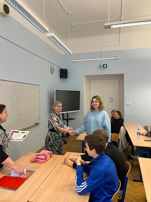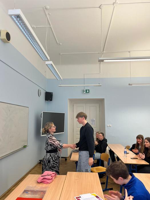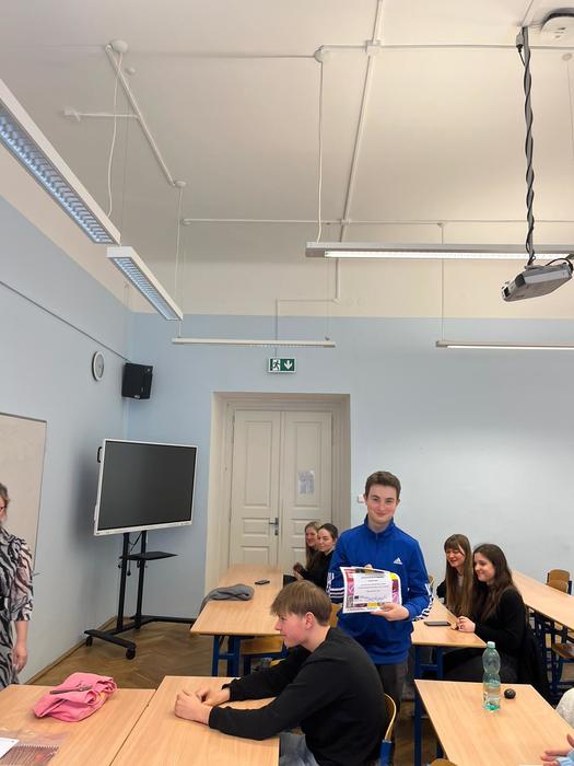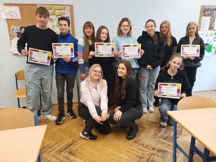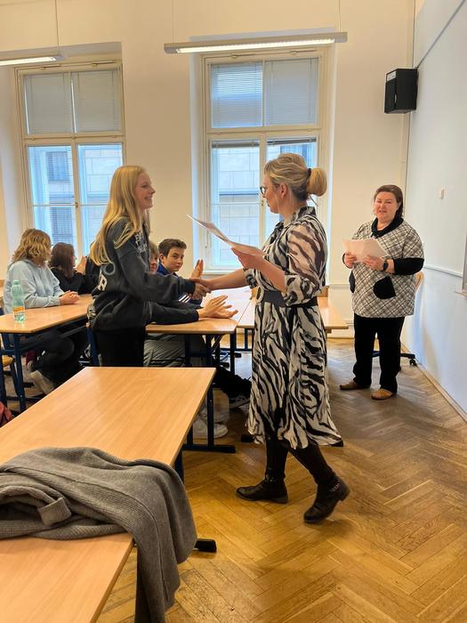 Dne 29.2. se výměnný pobyt našich kamarádů z Hamburku chýlil ke konci a přišel poslední společně strávený den, který jsme začal předáním certifikátů za úspěšné absolvování výuky na naší škole. Zhodnotili jsme, co nám projekt přinesl a němečtí studenti si vybrali, jaký obor by je u nás bavil studovat nejvíce. Poté jsme všichni vyrazili do kavárny na dortík a kávu, kde jsme se naposledy se všemi dojemně rozloučili.