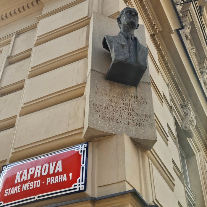 Až budete vycházet z metra Staroměstská a pujdete Kaprovou ulicí směrem k naší škole, na rohu s Křižovnickou ulicí zvedněte hlavu od mobilu - uvidíte nad sebou mramorovou pamětní desku s bustou jednoho ze dvou českých nositelů Nobelovy ceny profesora Jaroslava Heyrovského, který se v tomto domě v roce 1890 narodil.