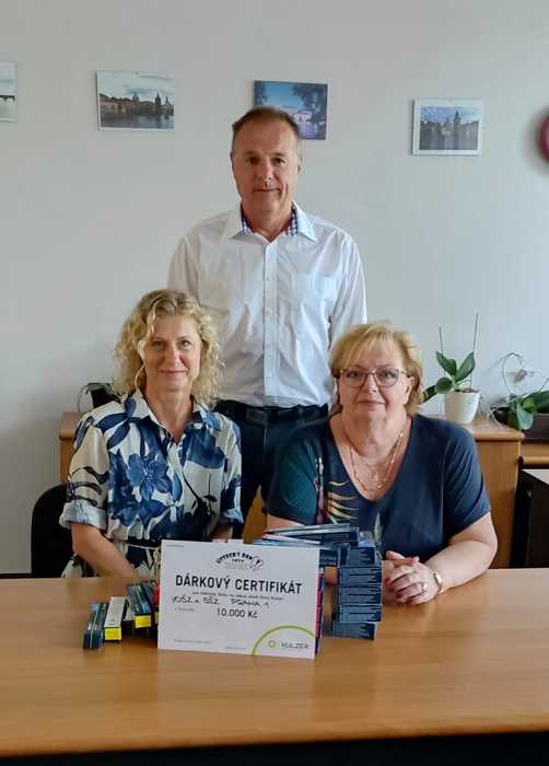 Kulzer. Výhru předal tento týden ředitelce školy PhDr. Zuzaně Pohlové a Bc. Petře Zetkové, která Karolínu na soutěž připravovala, zástupce firmy pan Ing. Martin Kutáč.