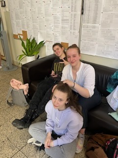 ani my ani naši žáci, kteří si pauzu mezi vyučovacími hodinami zpestřili. Originální "slepice" pobavila, do vyučování samozřejmě nešla. A i copánky, které děvčata pletly, se líbily.