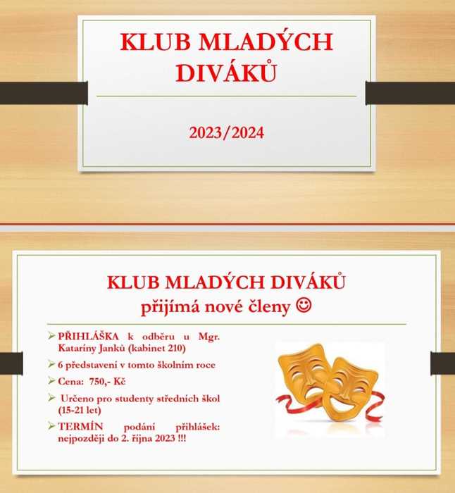 Tentokrát společně navštívíme 6 představení, cena letošního členství je 750,-Kč a přihlášky jsou k odběru v kabinetě číslo 210.