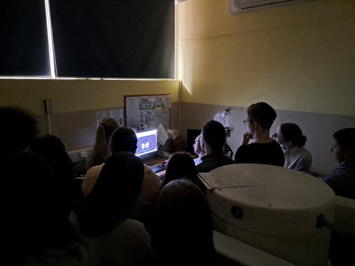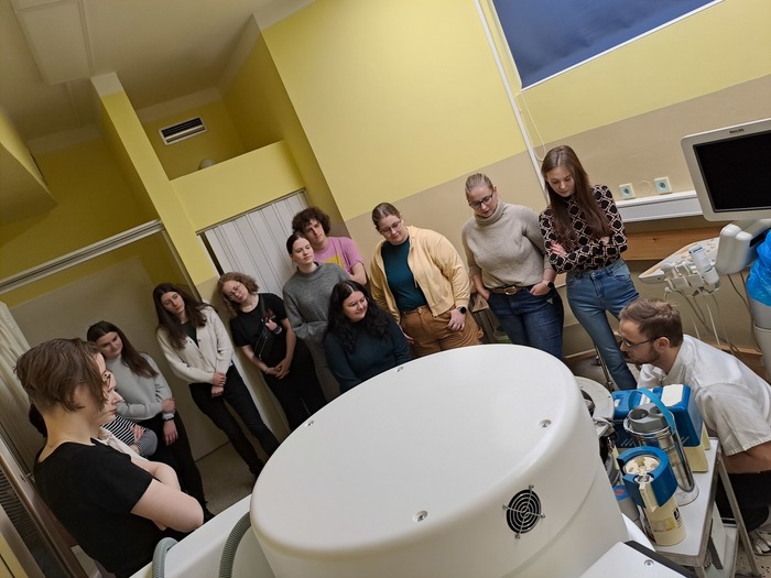 Studenti z 2. DFA se svým odborným pedagogem Mgr. Pavlem Novákem, DiS., navštívili v rámci výuky předmětu "Základy radiofarmacie" Kliniku radiologie a nukleární medicíny Fakultní nemocnice Královské Vinohrady. Studenti se seznámili s chodem oddělení nukleární medicíny a jako bonus se podívali na vyhodnocování diagnostických obrazů sonografie, počítačové tomografie i nukleární medicíny (obrázek ve tmě).